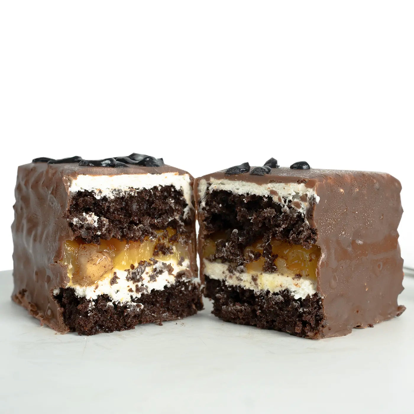 Gerçek balkabağı dolgusu, kıyılmış ceviz parçacıkları ve hafif beyaz çikolata kremasıyla hazırlanan Yılbaşı Özel Balkabaklı Pasta, siyah ıslak kek tabanı ile yılbaşının sıcak ve nostaljik lezzetini bir araya getiriyor.